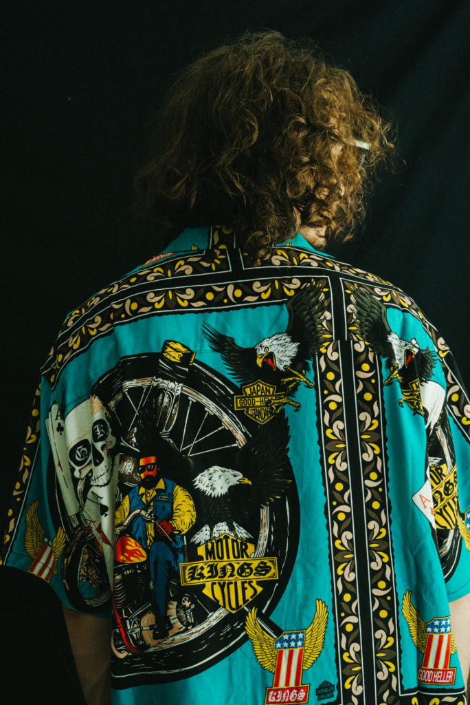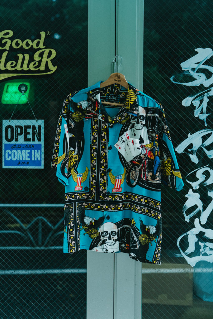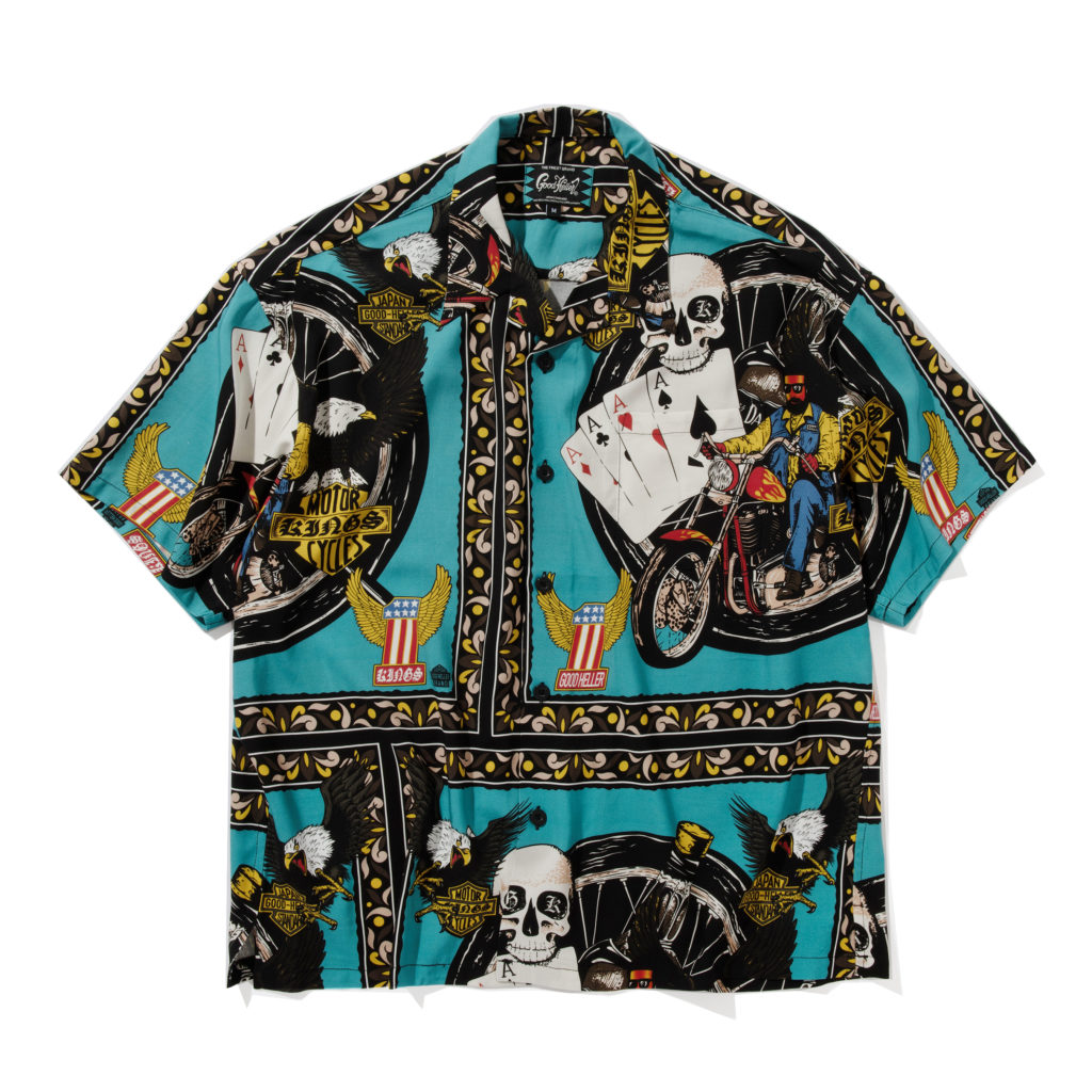 熊本県の取扱店”KINGS”とのスペシャルアイテム第四弾。オーナー義間氏のコレクターズアイテムの中から氏が今回ピックアップしたのはバイカーデザインが踏んだんに詰まった80年代の柄のネル生地をサンプリングして柄を起こし、バンダナ風に作製しパネル型の総柄にて作製。各随所にはアウトローバイカーやウィング、トランプなどオリジナルデザインにはブランドロゴやKINGSのロゴを。カラーリングも80年代らしいターコイズブルーをメインカラーに夏らしい一枚に。サイズ感も大判でインパクトある一枚に。 生地は着心地と高級感のあるレーヨン素材をベースにボックスタイプの開襟にてリリース。