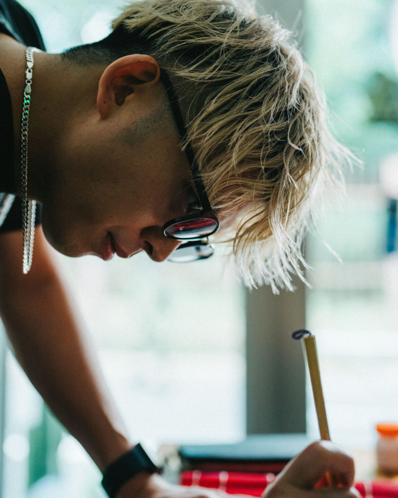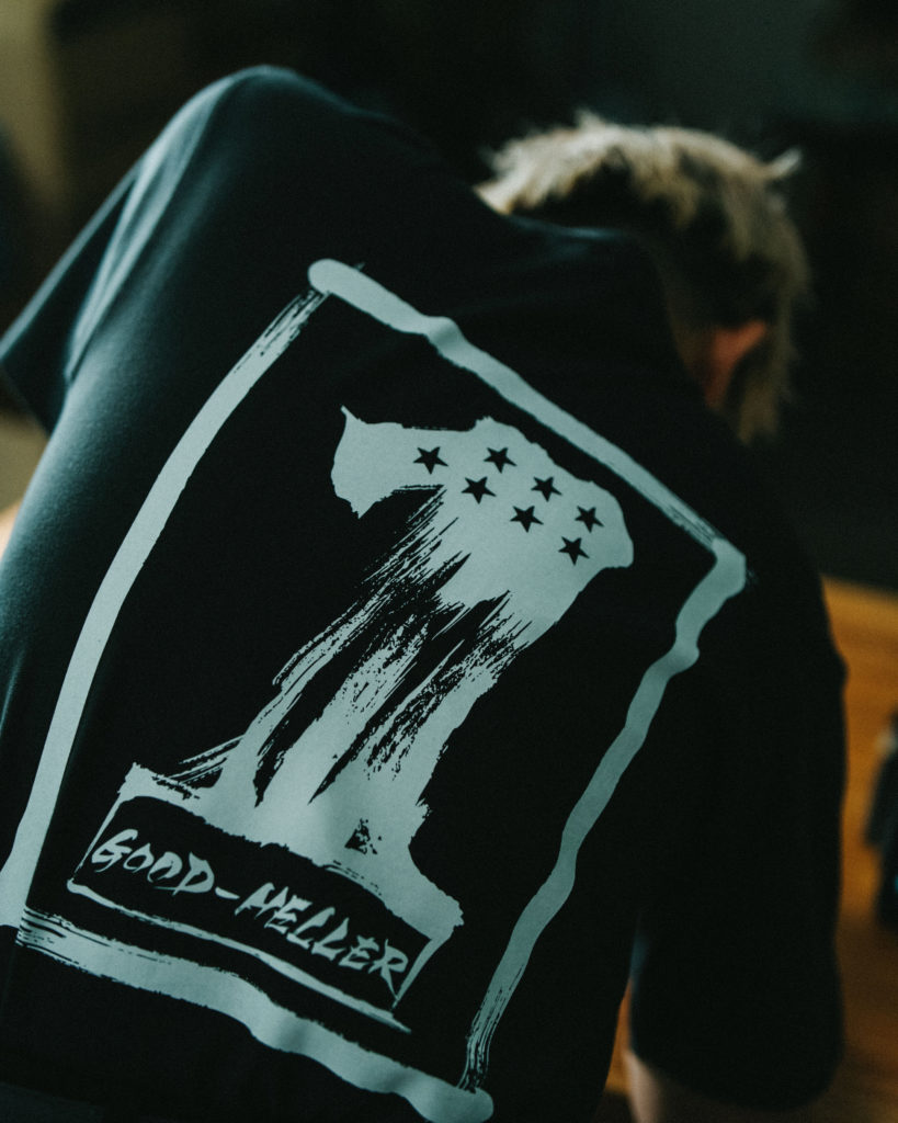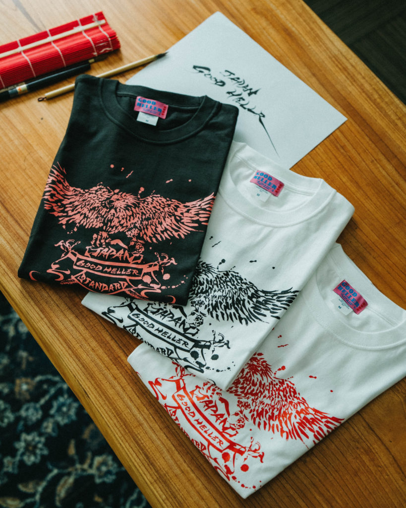 書道家”内山崚”が筆で書き起した白頭鷲は掠れと曲線が独特な雰囲気を醸し出しフロントにオン。背面には同じく筆でバイカーTシャツで用いられるNO.1のロゴを。和洋がクロスオーバーしたアメリカンTシャツの完成。ボディはグッドヘラー定番の7.4OZのヘビーウェイトTシャツを使用。
