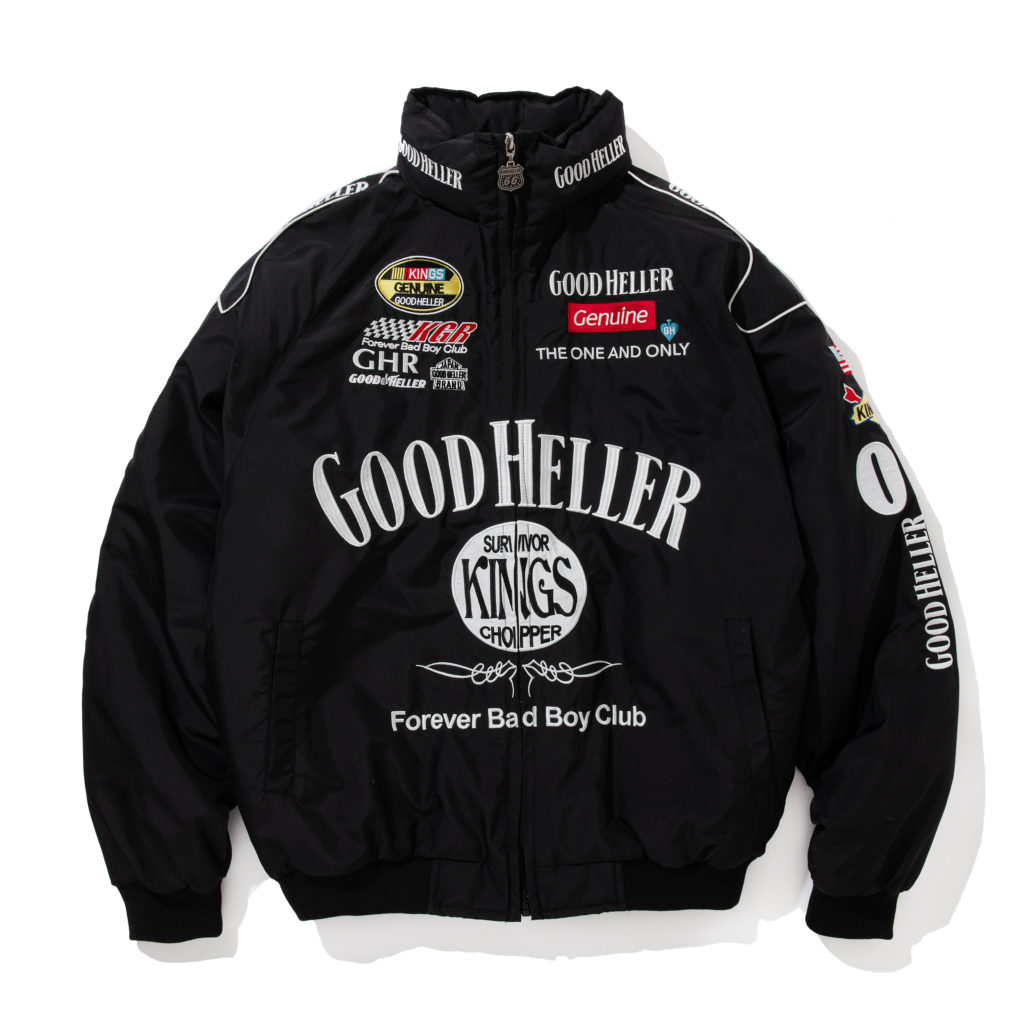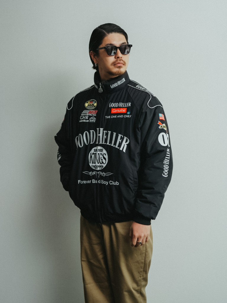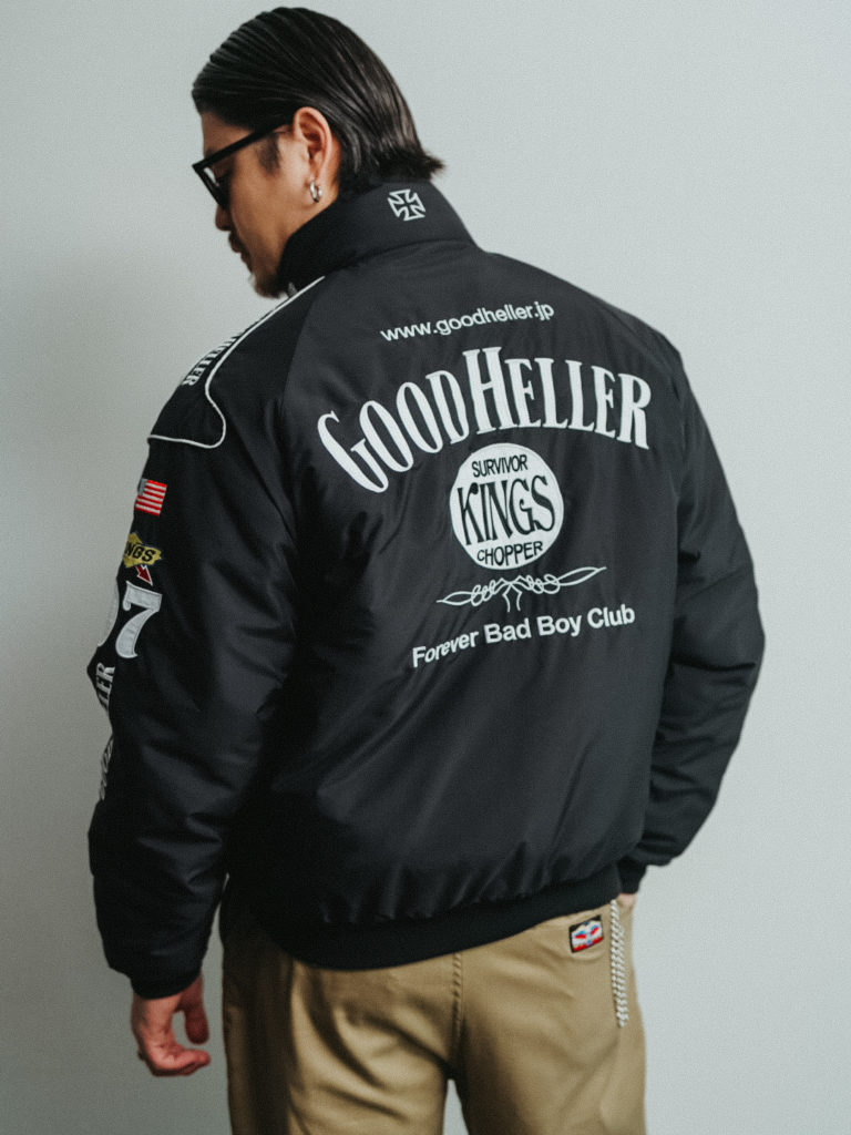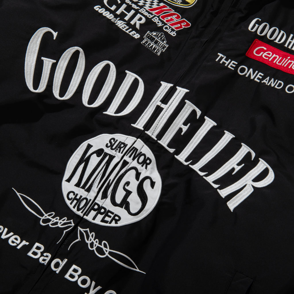 熊本県の取扱店”KINGS”とのスペシャルアイテム第五弾。アルコールメーカーのスポンサードレーシングジャケットをベースに、フロントにはアーチ型でGOOD HELLERのロゴを刺繍、同じく、その下にはサークル型でKINGSのロゴを。両胸や背面首周りなどにも各スポンサーロゴを両者のロゴにて一つ一つオリジナルで製作。シルエットは身幅をややゆったり、着丈はやや短めに設定。首元のスタンドカラー部分は防寒性を考慮し高さをつけ、ややタイト目に設定。裏地には中綿入りのやや肉厚なポリエステル生地に。フロントジップのトップ部分もオリジナルでアメリカンテイストオリジナルロゴトップを製作。両社の想いがふんだんに詰まったスペシャルな一着の完成。