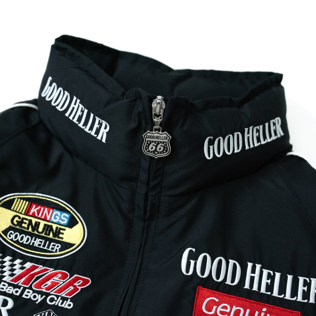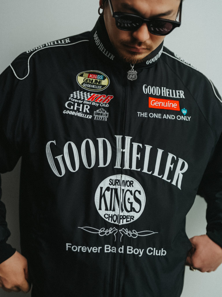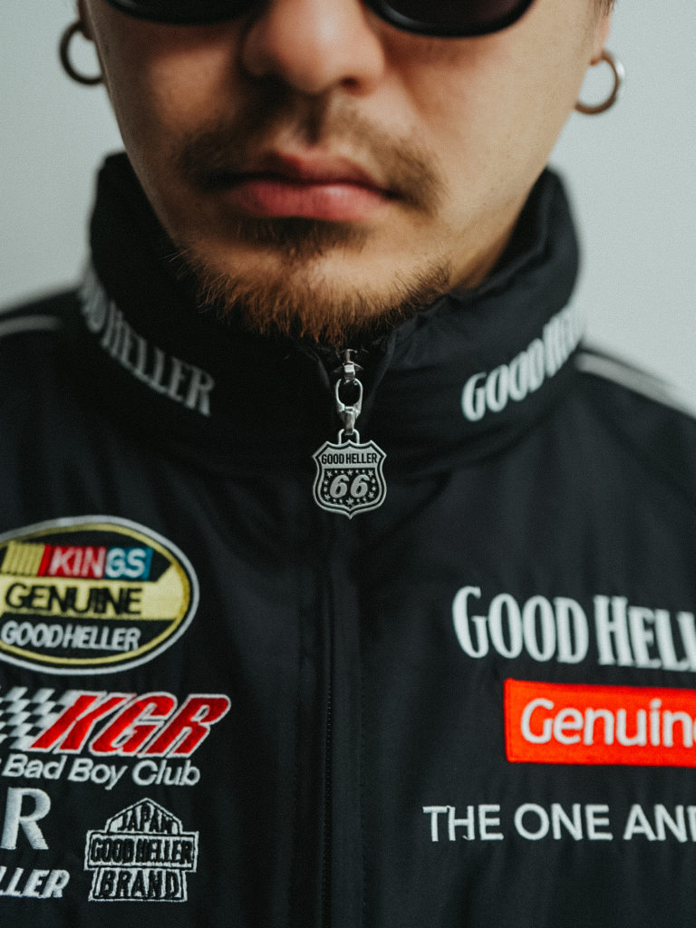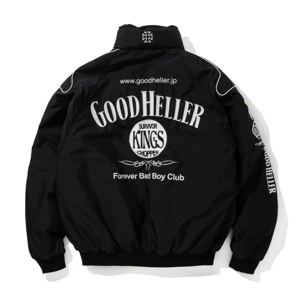 熊本県の取扱店”KINGS”とのスペシャルアイテム第五弾。アルコールメーカーのスポンサードレーシングジャケットをベースに、フロントにはアーチ型でGOOD HELLERのロゴを刺繍、同じく、その下にはサークル型でKINGSのロゴを。両胸や背面首周りなどにも各スポンサーロゴを両者のロゴにて一つ一つオリジナルで製作。シルエットは身幅をややゆったり、着丈はやや短めに設定。首元のスタンドカラー部分は防寒性を考慮し高さをつけ、ややタイト目に設定。裏地には中綿入りのやや肉厚なポリエステル生地に。フロントジップのトップ部分もオリジナルでアメリカンテイストオリジナルロゴトップを製作。両社の想いがふんだんに詰まったスペシャルな一着の完成。
